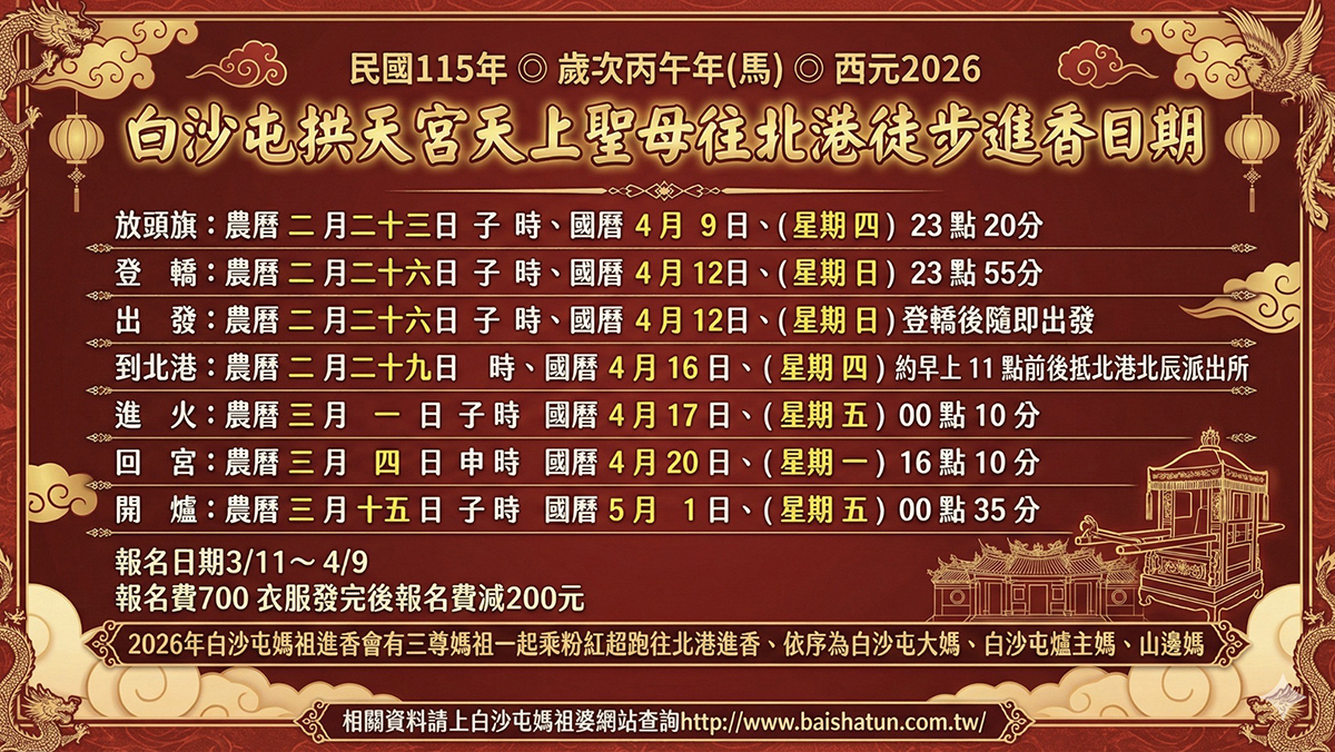 2026年白沙屯媽祖進香活動將於4月12日晚上23點20分登轎,準備就緒後旋即出發啟程。