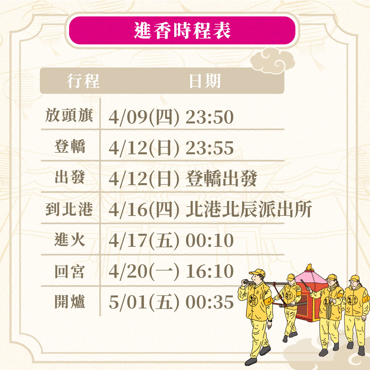 預計於4月16日抵達北港,並於4月17日0點10分進行進火儀式;返程4月20日回宮,全程從登轎到回宮共8天7夜,整個活動將於5月1日開爐圓滿結束。