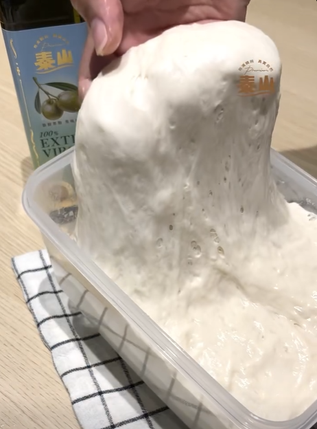 3、加蓋防止麵團乾掉,間隔30分鐘翻折4次之後冷藏約12小時發酵。