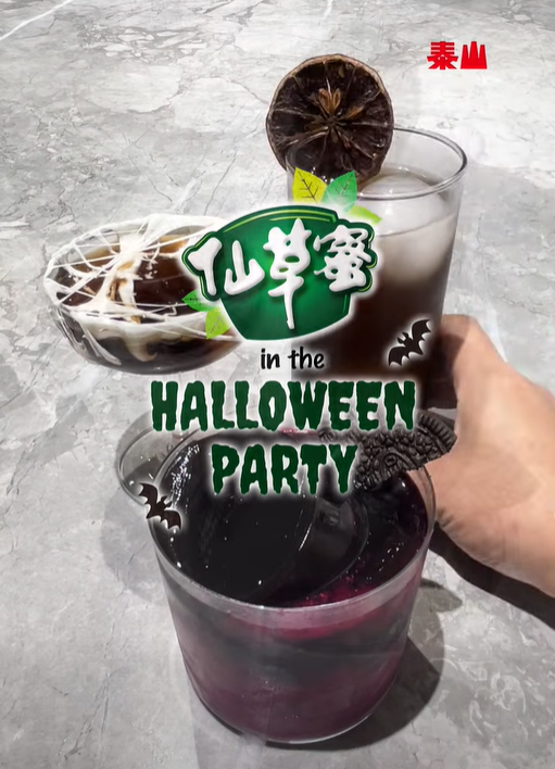 將3顆棉花糖加熱變成融化狀,運用一點小技巧,將棉花糖交錯成蜘蛛絲狀,再倒入仙草蜜茶,瞬間變成應景調飲。