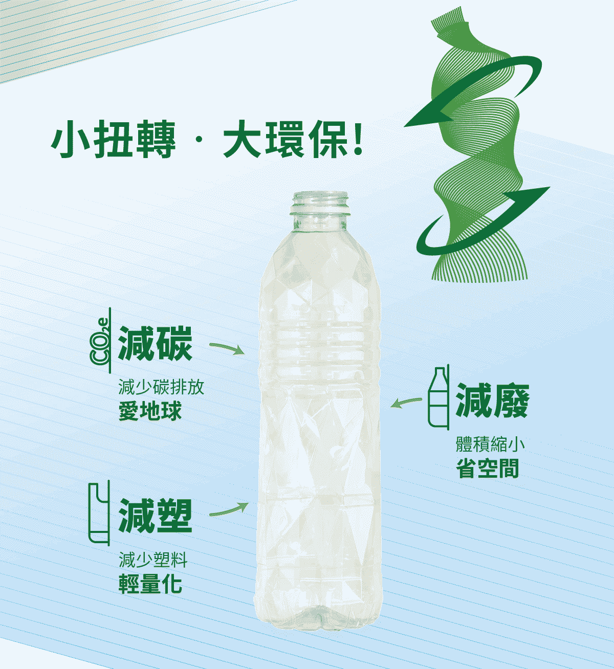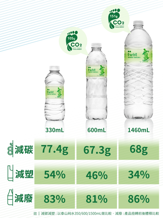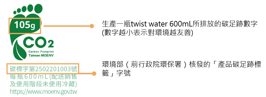 舉例來說twist water600mL 減少的碳排放量 67.3g計算,若消費者都喝twist water約可減少 67,300,000,000 g CO₂ (673億碳排放量)