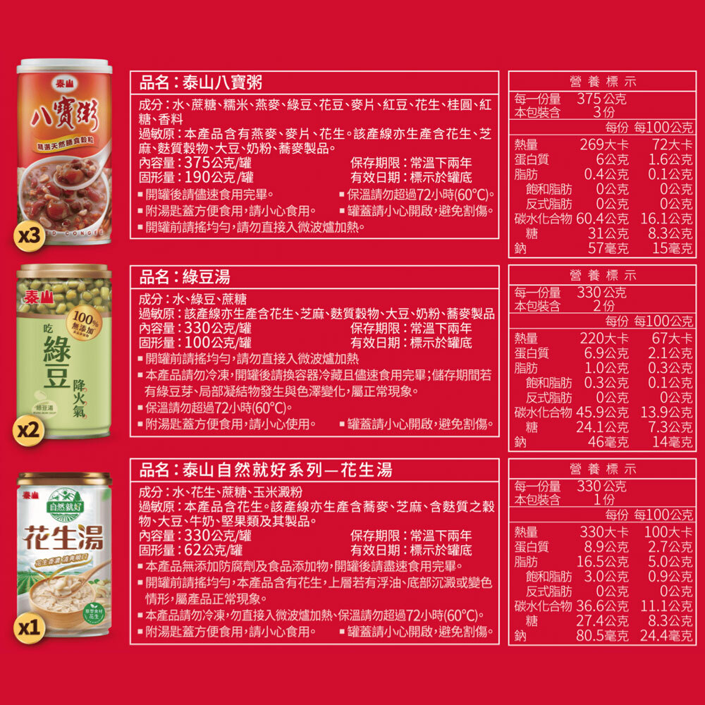 商品組合/規格:八寶粥375g X 3罐/綠豆湯330g X 2罐/自然就好花生湯330g X 1罐 商品品名:泰山平安好運禮盒 |